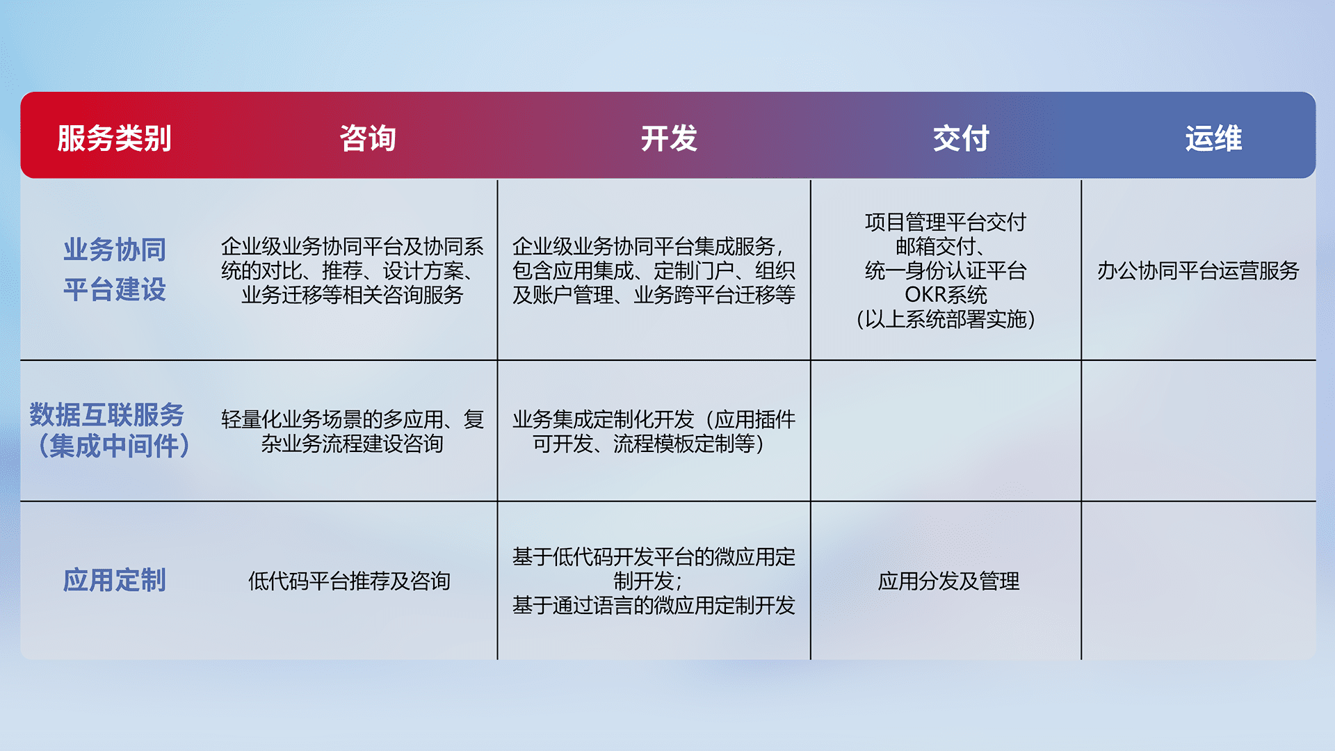 针对钉钉、、企微、、IDaas等平台级产品提供产品的规划、、、方案、、、、交付、、、定制化开发等服务,,,,实现如统一协同办公、、智能客户服务、、混合会议管理、、、智能数据查询、、、等业务场景,,,实现数字化转型。。。